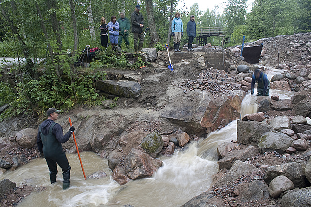 Vaikka vesi jo virtaa tässä kalatiessä, vaatii se vielä viimeistelyä. Kasvien juurruttaminen rannoille ja vesisammaleen vedenalaisiin kiviin, altaiden kiveäminen sekä parin altaan soraistaminen kutupaikoiksi ovat esimerkkejä jäljellä olevista viimeistelytöistä.