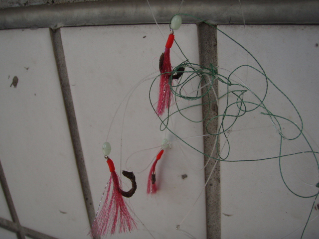 Yhdeltä muulta uusmaalaiselta joelta löytyi kiinteä pyydys, joka oli selvästi viritetty taimenia varten. Se oli pitkäsiima, johon oli ripustettu värikoukkuja sekä matoja. Ohessa kuvassa esimerkkikoukkuja kyseisestä siimavirityksestä.