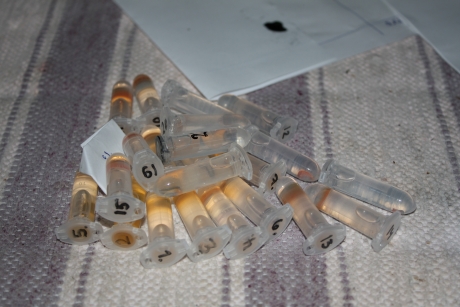 Taimenilta kerättyjä evänäytteitä näyteputkissa odottamassa tulevia tutkimustarpeita