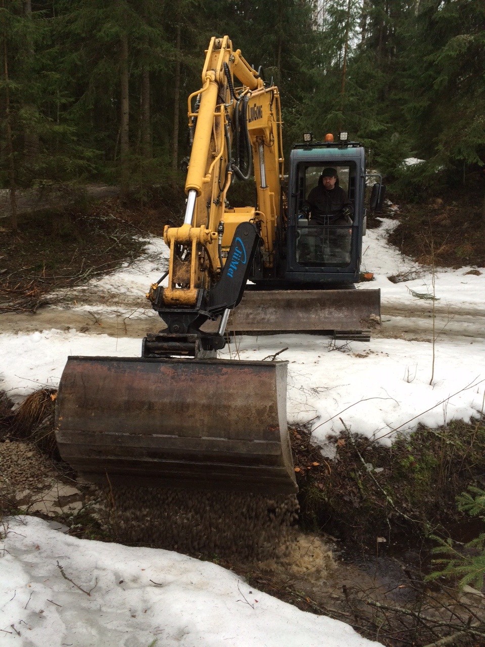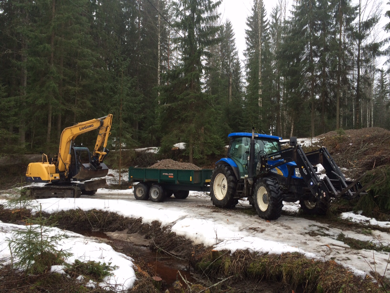 Näillä viimeisillä lumi- ja jäämaille on ajettu lisää kivi- ja sorakuormia koskille ja puroille. Osa kutupaikkojen ja kalanpoikasten suojapaikkojen luomismateriaaleista on lisätty suoraan vesiuomaan ja osa jätetty rannalle.
